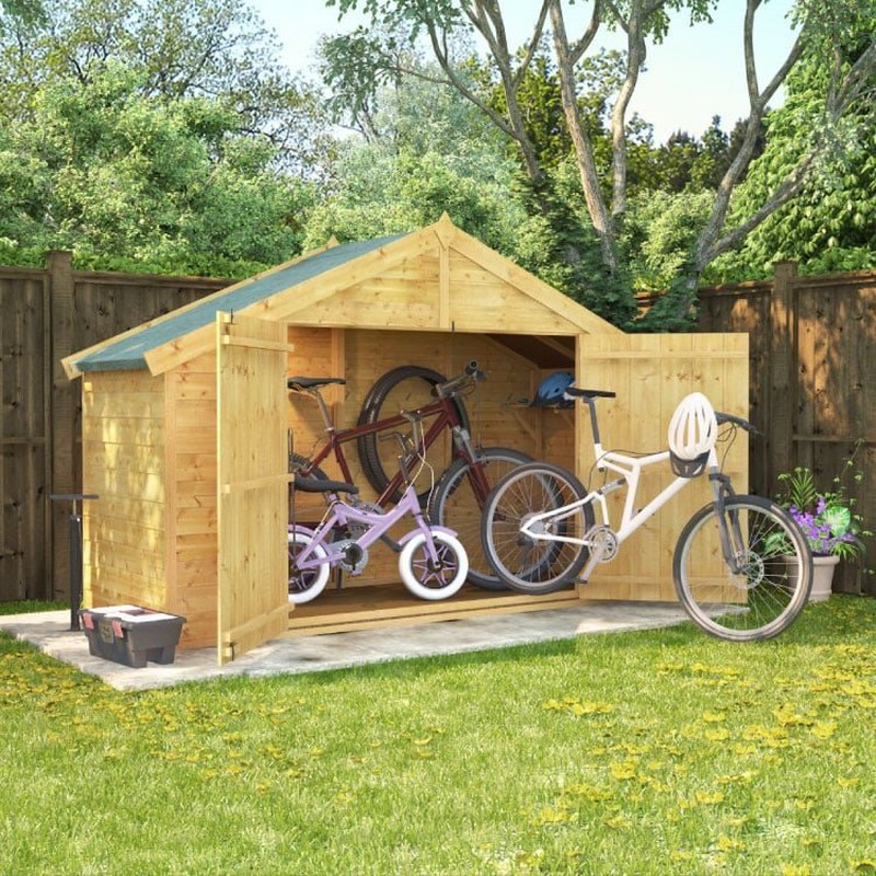 Store Your Bikes and Accessories with Ease in This Great Value Apex Bike Storage Unit. Width: 2.60m (8ft6) Depth: 0.92m (3ft) Eaves: 1.01m (3ft4) Ridge: 1.63m (5ft4). 7mm Overlap Panels. Square Cut Overlap Construction. Simple Apex Roof Styling. T&g Boarded Double Doors. Premium Versatile Store. Extra Wide Double Doors for Easy Access. 10 Year Warranty. Optional Pre Assembled Floor: (9mm Osb, 10mm Solid Sheet, 11mm Tg, 11mm Pressure Treated Tg, 19mm Pressure Treated Tg, 19mm Tg). Optional Roof: (9mm Osb, 8mm Solid Sheet, 11mm Tg). Optional Heavy Duty Roof Includes Additional Truss''''''''''''''''s. Optional Felt Options: Sand or Mineral. Sold By:Garden Buildings Direct