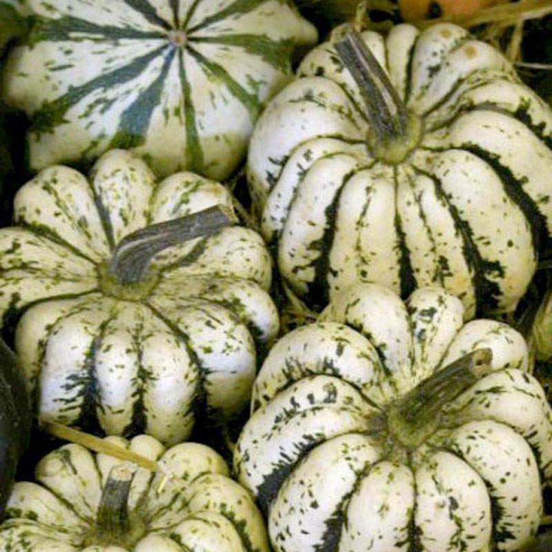 White Squash with Dark Green Stripes and Deep Ribs, Up to 300g and 12cm Diameter. Sweet, Orange Flesh. Trailing. Sold By:Suttons