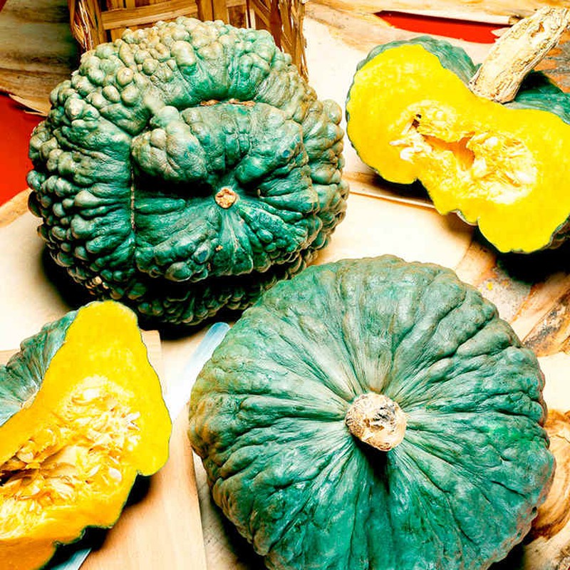 The Heirloom Sea Pumpkin of Chioggia on the Coast of Italy. the Large Turban Shaped Fruit Are Deep Blue Green One of the Most Beautiful and Unique of All Squashes!a Perfect Variety for Market Gardeners. the Rich, Sweet Flesh is a Deep Yellow Orange and of Good Quality, Delicious Baked or in Pies. the Fruit Weigh About 5kg Each and Are Produced on Vigorous Vines. Sold By:Suttons